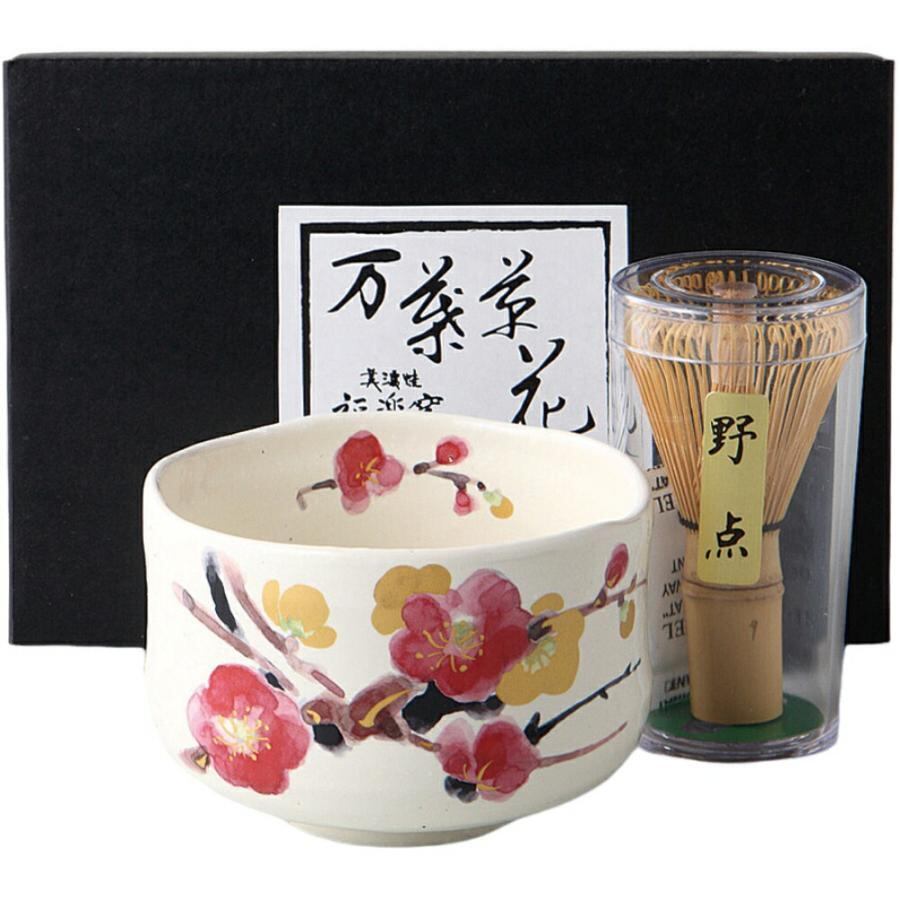 白地に金銀の梅を彩った抹茶椀と茶筅セットです。
